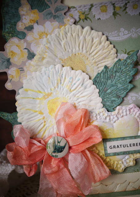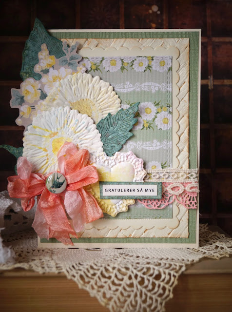 Dette er et blomsterkort laget med mange av de nye produktene som Tim Holtz har designet for våren. Jeg har brukt mønsterpapir og button fra Idea-ology. Blomstene, hjertet og bakgrunnen er laget med 3D embossingfoldere fra Sizzix. Bladene og blonden er stanset ut med dies fra Sizzix og teksten er fra et tekstark fra Papirdesign. Blomstene, bladene og silkebåndet har fått en dæsj med Distress ink.